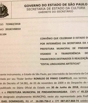 Na tarde de quinta-feira (5), o prefeito de Pindamonhangaba assinou convênio com a Secretaria de Estado da Cultura- SEC para a aplicação de 250 mil reais em projetos de atividades culturais, sendo 200 mil da SEC e 50 mil de contrapartida da Prefeitura de Pindamonhangaba.