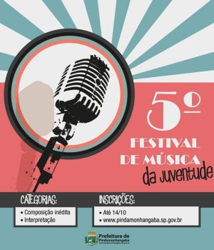As inscrições seguirão até dia 11 de outubro (quinta-feira). Para se inscrever, basta entrar no site: www.pindamonhangaba.sp.gov.br, depois clicar no botão “5º Festival de Música da Juventude”; clicar no botão “Inscrição”; preencher os campos solicitados; inserir cópia do RG e CPF; salvar em PDF; anexar gravação da música na íntegra e finalizar a inscrição.