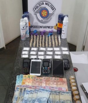 Durante buscas nas proximidades da abordagem, os policiais localizaram 68 eppendorfs com cocaína, 17 porções da mesma droga enroladas em sacos plásticos e 09 pedras de crack, além de 08 celulares que eram usados para comunicação sobre a chegada do policiamento na região e R$ 572,10 em dinheiro.