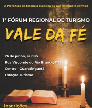A Prefeitura de Guaratinguetá apresenta no próximo dia 26 de junho, às 9h, na Estação Turismo (Rua Visconde do Rio Branco, 115 – Centro), o I Fórum Regional de Turismo Vale da Fé. Com o objetivo de discutir de forma integrada como promover o desenvolvimento do turismo em nossa região, o Fórum é uma grande oportunidade para empresários de hotéis, pousadas, restaurantes, bares, agências de turismo e demais áreas relacionadas.