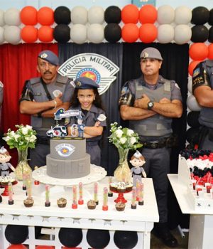 Para completar a surpresa, os policias ainda presentearam Heloysa com uma camiseta, uma mini farda e uma boina da Força Tática e posaram para mais fotos com a aniversariante.