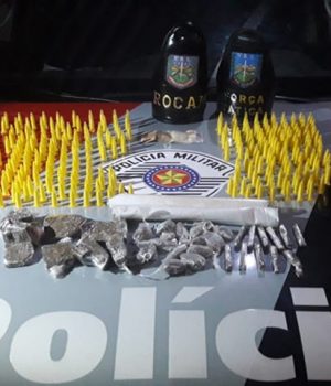 Durante revista no interior do veículo foi encontrada uma mochila, e no seu interior mais 27 porções de maconha e mais 8 tabletes da mesma droga, 318 pinos de cocaína, além de material para embalar drogas.