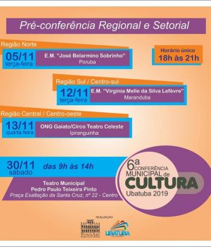 Interessados em fazer parte do Conselho Municipal de Política Cultural – CMPC deverão participar de pelo menos uma Pré-conferência Regional e Setorial para concorrer a eleição do setorial desejado no dia 30/11 na 6ª Conferência Municipal de Cultura de Ubatuba.