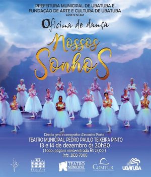 O espetáculo “Nossos Sonhos” da Oficina de Dança FundArt é uma realização da Prefeitura Municipal de Ubatuba por meio da Fundação de Arte e Cultura de Ubatuba e conta com apoio da Comtur – Companhia Municipal de Turismo de Ubatuba.