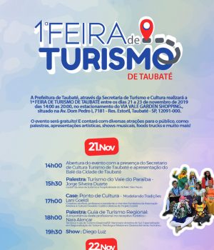 A 1ª Feira de Turismo de Taubaté acontece de quinta (21) a sábado (23), das14h às 22h, no estacionamento do Via Vale Garden Shopping e tem a realização da Prefeitura Municipal de Taubaté, por meio da Secretaria de Turismo e Cultura da cidade, com entrada gratuita ao público.