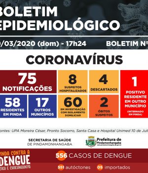 O último Boletim epidemiológico, divulgado às 17h24 deste domingo (29), pela Prefeitura, aponta que Pindamonhangaba tem 75 casos suspeitos, 1 caso importado confirmado, 4 casos descartados, nenhum confirmado e 2 mortes suspeitas de infecção pelo coronavírus.