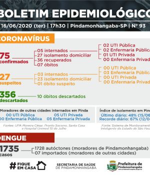 Com os dados de hoje, Pinda passa a ter 75 pessoas testadas positivo para Coronavírus, e 36 recuperados. O índice de isolamento na cidade está em 48% segundo o Sistema de Monitoramento Inteligente do Estado de São Paulo.
