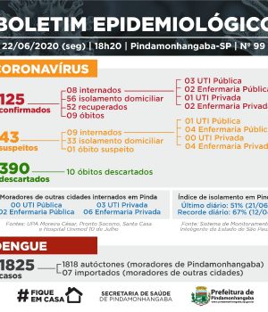 Com os dados de hoje, Pinda passa a ter 125 pessoas testadas positivo para Coronavírus, e 52 recuperados. O índice de isolamento na cidade está em 51% segundo o Sistema de Monitoramento Inteligente do Estado de São Paulo.
