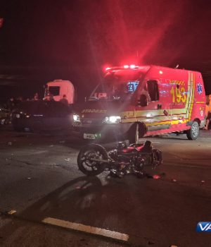 Na noite deste sábado (11), cinco pessoas ficaram feridas, entre elas um motociclista em estado grave, em um acidente na rodovia Amador Bueno da Veiga, em frente ao Pátio Pinda.