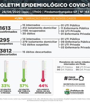 Com os números de hoje, Pinda chega a 1613 pacientes testados positivos para coronavírus desde o início da pandemia na cidade. Hoje, temos 57% de ocupação de leitos de enfermaria e 33% de ocupação de leitos de UTI, somando redes pública e particular. O índice de isolamento na cidade está em 44%.