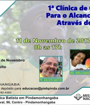 A 1ª Clínica, por sua vez, tem suas inscrições prorrogadas até a proximidade da data da mesma, com o custo de R$ 25,00 por pessoa. O valor deverá ser depositado no Banco Bradesco – Agência 0216 – Conta-Corrente 12.976-3, e o comprovante terá que ser enviado para o e-mail educacao@piebpinda.org.br.
