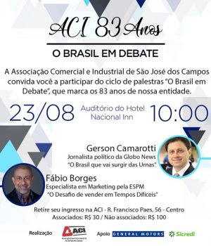 Em comemoração aos 83 anos, que se completam no dia 23 de agosto, quinta-feira, a Associação Comercial e Industrial de São José dos Campos trará dois nomes importantes da comunicação para debater sobre temas pertinentes. O dia será marcado por um ciclo de palestras com o tema ‘O Brasil em Debate’.