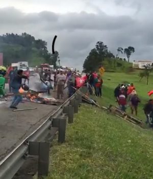 A Polícia Rodoviária Federal informou que cerca de 80 manifestantes invadiram a pista por volta das 6h30 na altura do km 120,4 e atearam fogo em pneus. Alguns motociclistas chegaram a entrar em confusão com os manifestantes para tentar passar pela barreira.