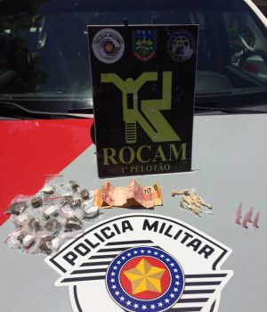 Durante revista pessoal no rapaz de 18 anos, foi localizada uma sacola plástica contendo, 1 bucha de maconha, 5 eppendorf’s com cocaína e 19 pedras de crack, além R$ 30,00 em dinheiro. Em vistoria em um arbusto foi encontrada mais uma sacola, contendo 15 porções de maconha, prontas para a venda. Já com o menor de 15 anos nada de ilícito foi encontrado, porém, o rapaz de 18 anos confirmou que ele ajudava com venda das drogas.