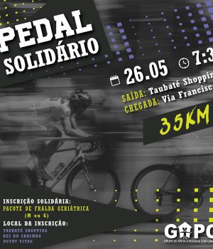 A edição 2019 do Pedal Solidário acontece no domingo (26), a partir das 7h30, com saída no Taubaté Shopping e chegada no Via Francisco, em Tremembé. A corrida tem como objetivo a arrecadação de fraldas geriátrica (G e M), item obrigatório no momento da realização da inscrição, que, posteriormente, serão repassadas ao GAPC (Grupo de Apoio a Pessoas com Câncer).