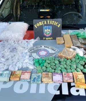 Durante vistoria foram localizados 3 tijolos de maconha, 1 pedaço de crack e mais 1.491 porções da mesma droga, prontas para a venda, 540 pinos de cocaína e mais 3 mil eppendorfs vazios, além de 1 balança de precisão, material utilizado para embalar drogas e a quantia de R$ 6.641,00 em dinheiro.