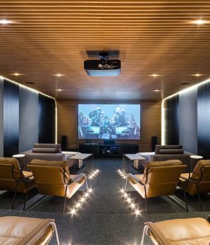 O arquiteto Gustavo Martins, que assina o Cinema da casa, com 55 m², venceu a disputa como o ambiente preferido. Seu espaço reúne tecnologia, acústica, sonorização e design, conciliando conforto, design e arte, além de uma elegante composição de cores e texturas.