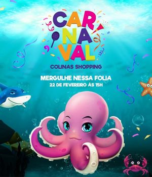 Em um cenário lúdico e com descontração, o Colinas Shopping promove no dia 22 de fevereiro (sábado), às 15h, a sua tradicional matinê de Carnaval. Neste ano, a decoração da festa – cujo tema é “Mergulhe nessa Folia” – é inspirada no fundo do mar, reunindo dez personagens marinhos e uma banda com oito músicos para animar a tarde carnavalesca.