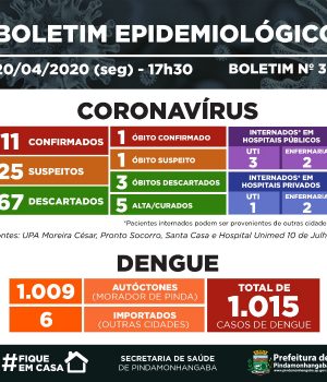 Com mais esses dois casos confirmados, Pindamonhangaba conta, na data de hoje, com 11 casos confirmados e 25 suspeitos aguardando resultado de exame. À população em geral, a Prefeitura de Pindamonhangaba continua com a recomendação de isolamento social, e caso seja necessário sair, o uso de máscara e higienização contínua das mãos com água e sabão ou álcool gel, e evitar aglomerações.