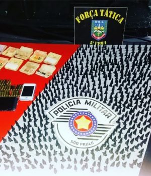 Os policiais foram até a residência do indivíduo no Cecap I e durante revista, encontraram mais 450 pinos de cocaína, R$ 4.977,00 em dinheiro, 1 Rádio Transmissor HT, 34 munições intactas e 01 deflagrada de calibre 38, 01 munição intacta de calibre 20 e mais 1 aparelho celular.