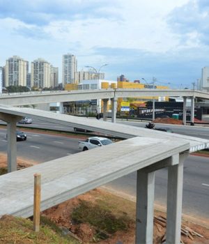Agora, a obra entra na etapa de concretagem das lajes e a implantação do guarda-corpo na passarela do Anel Viário e início da execução da passarela que passará sobre o Córrego Senhorinha, na avenida Jorge Zarur.