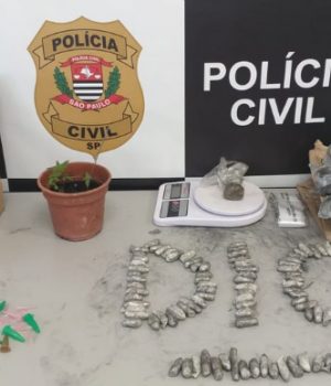 No pacote apreendido os policiais encontraram 100 porções de maconha embaladas para venda. No local também foram encontrados materiais para embalar drogas, mudas de maconha plantadas em um vaso, pinos de cocaína e uma balança de precisão.