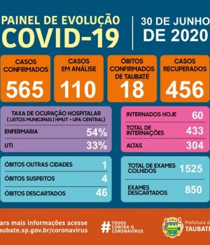 Taubaté chega ao final de junho com 565 casos confirmados de coronavírus. Foram confirmados nesta terça-feira, dia 30 de junho, mais 10 casos da doença. Todos os pacientes seguem em isolamento social em suas residências.
