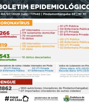 Com os dados de hoje, Pinda chega a 266 pessoas testadas positivo para covid-19 e mantém os 70 recuperados. Agora, são 15 óbitos por coronavírus em nossa cidade. O índice de isolamento na cidade continua em 47%, segundo o Sistema de Monitoramento Inteligente do Estado de São Paulo.