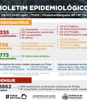Com os números de hoje, Pinda chega a 75% de ocupação de leitos de enfermaria e 55% de ocupação de leitos de UTI, somando redes pública e particular. O índice de isolamento na cidade está em 48%, segundo o Sistema de Monitoramento Inteligente do Estado de São Paulo.