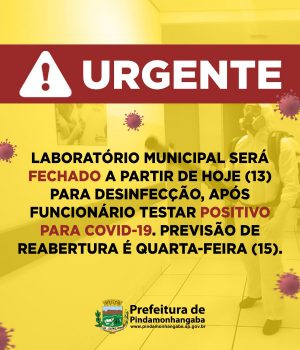 O laboratório municipal de Pindamonhangaba ficará fechado no período da tarde de segunda-feira (dia 13) e o dia todo na terça-feira (dia 14) para desinfecção e higienização do local, que deve ser reaberto na quarta-feira (dia 15).