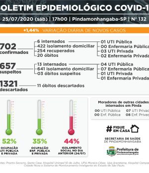 Com os números de hoje, Pinda chega a 702 pacientes testados positivos para coronavírus desde o início da pandemia na cidade. Hoje, temos 35% de ocupação de leitos de enfermaria e 52% de ocupação de leitos de UTI, somando redes pública e particular. O índice de isolamento na cidade está em 44%, segundo o Sistema de Monitoramento Inteligente do Estado de São Paulo.