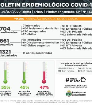 Com os números de hoje, Pinda chega a 704 pacientes testados positivos para coronavírus desde o início da pandemia na cidade. Hoje, temos 45% de ocupação de leitos de enfermaria e 55% de ocupação de leitos de UTI, somando redes pública e particular. O índice de isolamento na cidade está em 47%, segundo o Sistema de Monitoramento Inteligente do Estado de São Paulo, colocando Pinda no 14º lugar entre as 20 cidades com maior índice de isolamento do Estado.