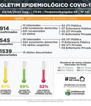 Com os números de hoje, Pinda chega a 914 pacientes testados positivos para coronavírus desde o início da pandemia na cidade. Hoje, temos 59% de ocupação de leitos de enfermaria e 67% de ocupação de leitos de UTI, somando redes pública e particular. O índice de isolamento na cidade está em 52%.