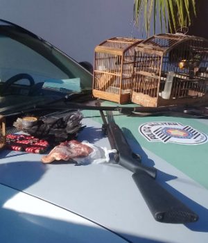 No local os policiais encontraram 5 aves – curió, trinca-ferro e coleiro – de forma ilegal, sem autorização do órgão competente, 2 armas – uma de fogo e uma de pressão, material para recarga de cartuchos, além de carne de paca e penas de jacú – animais da fauna silvestre e petrechos utilizados para caça.