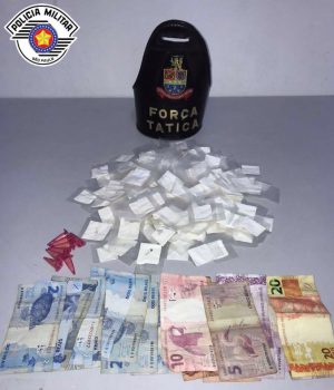 Durante revista pessoal foram localizadas 16 porções de cocaína e mais algumas porções e dinheiro do tráfico próximo do local da abordagem. No total foram apreendidos 150 porções de cocaína a vácuo, 8 pedras de crack e R$ 98,00 em dinheiro.