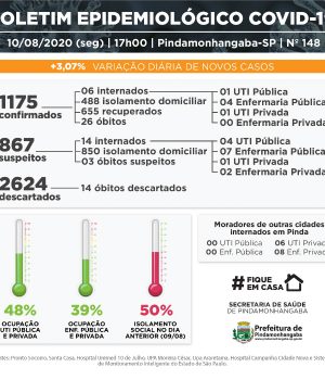 Com os números de hoje, Pinda chega a 1175 pacientes testados positivos para coronavírus desde o início da pandemia na cidade. Hoje, temos 39% de ocupação de leitos de enfermaria e 48% de ocupação de leitos de UTI, somando redes pública e particular. O índice de isolamento na cidade está em 50%.