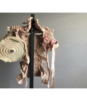 Carolina Sudati aka Translúcida /Bruta – Leveza – dispositivo 1, 2020. Materiais da escultura: Tecido, couro e metal (parafusos, porcas e arruelas). Dispositivo da série Procedimento para Evocar a Leveza. Acompanha protocolo. Dimensões: 47cm x 37cm x 25cm.