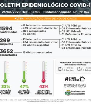 Com os números de hoje, Pinda chega a 1594 pacientes testados positivos para coronavírus desde o início da pandemia na cidade. Hoje, temos 47% de ocupação de leitos de enfermaria e 33% de ocupação de leitos de UTI, somando redes pública e particular. O índice de isolamento na cidade está em 43%.