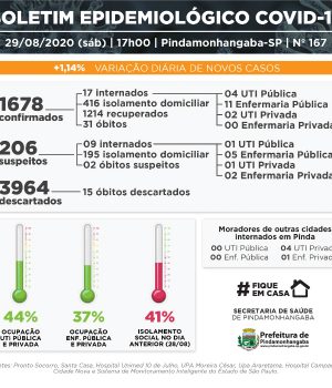 Com os números de hoje, Pinda chega a 1678 pacientes testados positivo para coronavírus desde o início da pandemia na cidade.