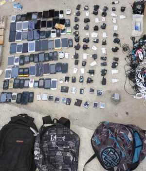 Quando os agentes penitenciários foram verificar o conteúdo das bolsas encontraram 76 aparelhos celulares com 64 carregadores, 24 fones de ouvido, 11 cabos USB, 26 chips, 1 aparelho MP 3, 1 máquina de tatuagem com 4 fracos de tintas, 182 papelotes de cocaína com peso de 140 gramas, 2 tabletes de cocaína pesando 1,721 quilo e mais 13 porções de cocaína com peso de 853 gramas. Também havia 8 tabletes e 6 porções de maconha pesando aproximadamente 4,054 quilos.