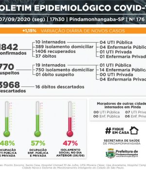 Com os números de hoje, Pinda chega a 1.842 pacientes testados positivo para coronavírus desde o início da pandemia na cidade, sendo que destes 1.406 já estão recuperados, representando 76,3% de recuperação. Hoje, temos 57% de ocupação de leitos de enfermaria e 48% de ocupação de leitos de UTI, somando redes pública e particular. O índice de isolamento na cidade está em 47%.