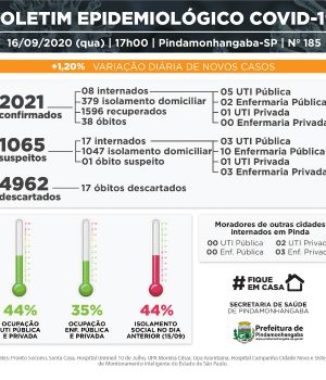 Com os números de hoje, Pinda chega a 2021 pacientes testados positivos para coronavírus desde o início da pandemia na cidade. Hoje, temos 35% de ocupação de leitos de enfermaria e 44% de ocupação de leitos de UTI, somando redes pública e particular. O índice de isolamento na cidade está em 44%.