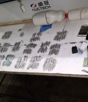 Após serem examinadas, foram encontrados dentro das garrafas plásticas: 172 invólucros de maconha com peso total de 568 gramas, 30 invólucros de cocaína com peso de 116 gramas, 5 celulares com 5 carregadores.