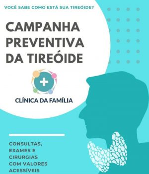 A Clínica da Família de São José dos Campos promove, no próximo dia 25, uma força-tarefa de prevenção às doenças relacionadas à tireoide. Em um único dia, os pacientes poderão passar por uma consulta com médico especialista em cabeça e pescoço, realizar exames de imagem e análises clínicas. A iniciativa tem o objetivo de conscientizar a população sobre os riscos de doenças relacionadas à glândula tireoide, inclusive o câncer.
