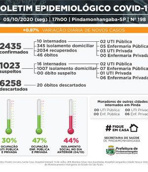 Com os números de hoje, Pinda chega a 2435 pacientes testados positivos para coronavírus desde o início da pandemia na cidade. Hoje, temos 47% de ocupação de leitos de enfermaria e 30% de ocupação de leitos de UTI, somando redes pública e particular. O índice de isolamento na cidade está em 44%.