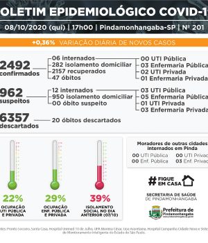 Com os números de hoje, Pinda chega a 2492 pacientes testados positivos para coronavírus desde o início da pandemia na cidade. Hoje, temos 29% de ocupação de leitos de enfermaria e 22% de ocupação de leitos de UTI, somando redes pública e particular. O índice de isolamento na cidade está em 39%.