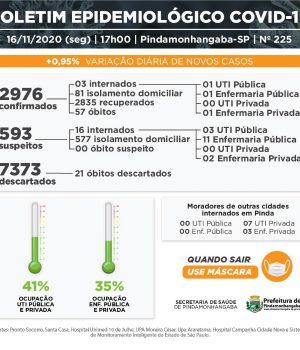 Com os números de hoje, Pinda chega a 2976 pacientes testados positivos para coronavírus desde o início da pandemia na cidade. Hoje, temos 35% de ocupação de leitos de enfermaria e 41% de ocupação de leitos de UTI, somando redes pública e particular.