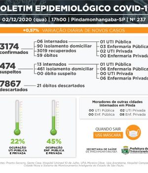 Com os números de hoje, Pinda chega a 3174 pacientes testados positivos para coronavírus desde o início da pandemia na cidade. Hoje, temos 45% de ocupação de leitos de enfermaria e 22% de ocupação de leitos de UTI, somando redes pública e particular.