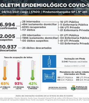 A Vigilância Epidemiológica de Pindamonhangaba divulgou, em seu Boletim Epidemiológico desta segunda-feira (8), quatro óbitos por covid-19, de moradores do Liberdade, Pasin, São Benedito e Shangri-lá. O boletim de hoje registra, ainda, 127 novos casos de covid-19 e 213 pacientes recuperados.