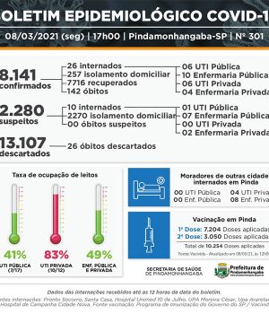 A VE registra, ainda, 34 novos casos de covid-19 e 71 pacientes recuperados. As UTIs públicas estão com ocupação de 41% e as UTIs particulares estão com ocupação de 83%. Enfermaria está com ocupação de 49%, somados os leitos públicos e particulares. Desde o início da pandemia até hoje são 8.141 moradores de Pindamonhangaba infectados pela covid-19.